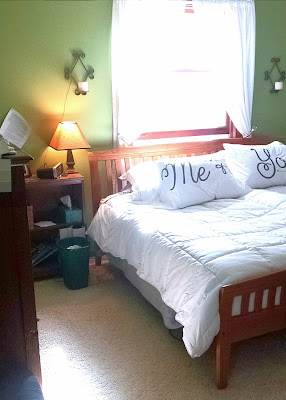 This shelf is something that will be used daily. My husband needs his alarm clock, so it's a part of the shelf. However, I was able to hide the ever present kleenex box with a cute little wooden crate from TJ Maxx. The lamp is also from TJ Maxx. Everything else is either so old I don't remember where it came from or it's a personally made item. Like that cute little plane my son painted for his Daddy on Father's Day. Presh.
